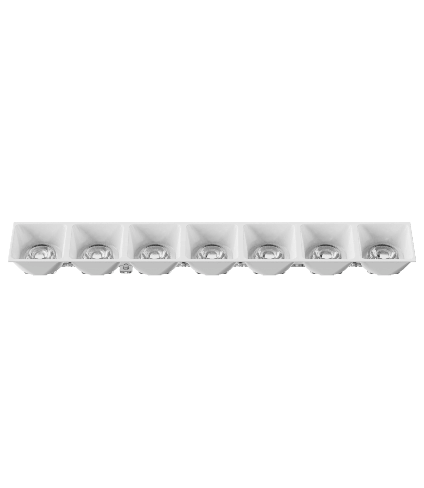 K2POLLUX7X1N101 consists of POLLUX7X1N lens and LVR2POLLUX7X101 white tall louvre (H = 20.25 mm) with glossy finishing. This product is ideal for applications requiring low UGR and discreet installation such as: Accent lighting, spot- and track lighting where narrow beam with smooth cut-off is required.