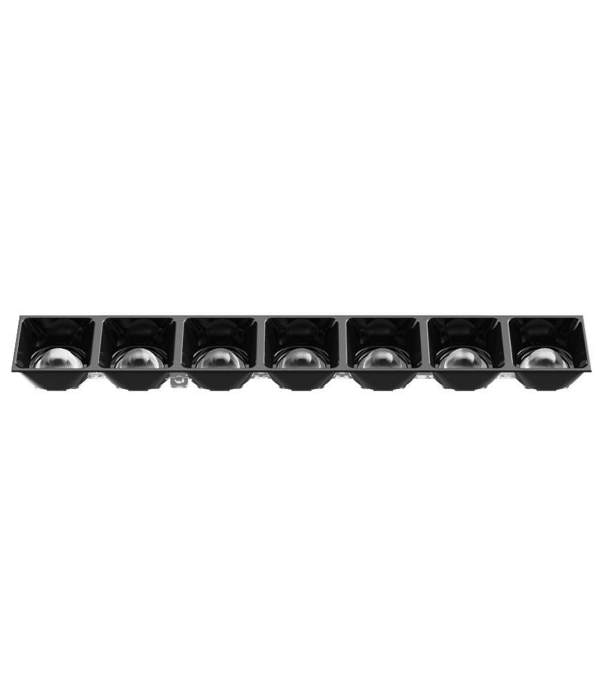 K2POLLUX7X1W102 consists of POLLUX7X1W lens and LVR2POLLUX7X102 black tall louvre (H = 20.25 mm) with glossy finishing. This product is ideal for suspended or recessed installations for Offices, Supermarkets, High bay and Hospitality applications: such as hotels. We recommend to put 2-4pcs of LEDs side-by-side to maximize efficiency and lumen output.