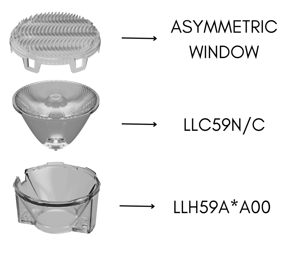 LLK59CW59AAAA00 is composed of a color mixing wall washing window (LLW59A), a Ø 45mm collimator (LLC59C) and a clear LLH59AAA holder.