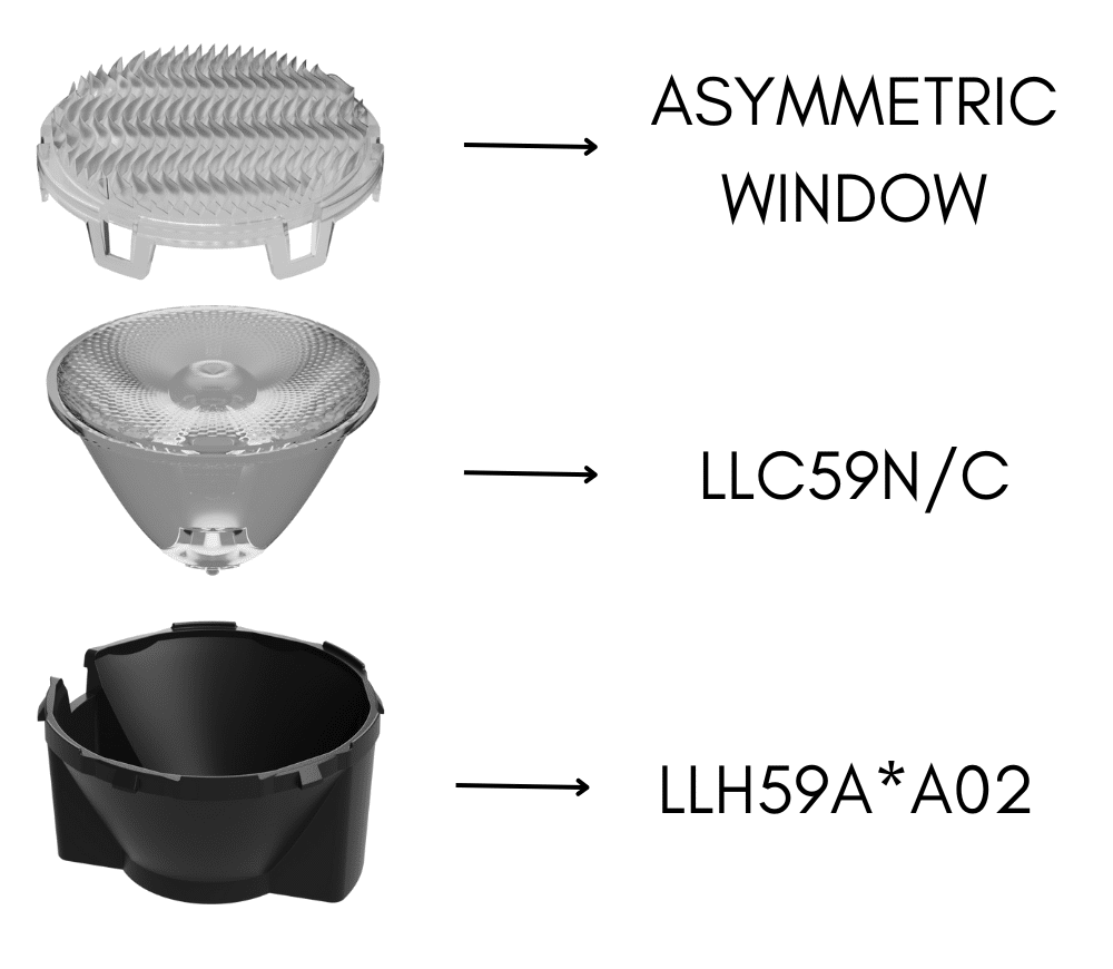 LLK59NW59AABA02 is composed of a color mixing wall washing window (LLW59A), a Ø 45mm collimator (LLC59N) and a black LLH59ABA holder.