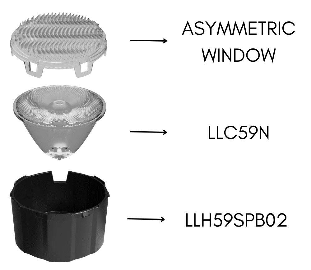 LLK59NW59ASPB02 is composed of a color mixing wall washing window (LLW59A), a Ø 45mm collimator (LLC59N) and a black LLH59SPB holder.
